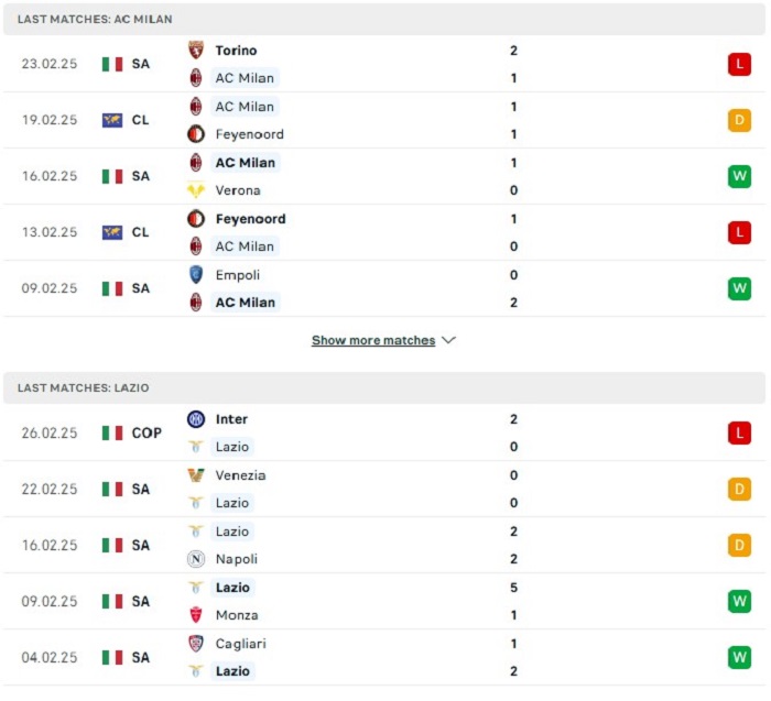 Phong độ gần đây AC Milan vs Lazio